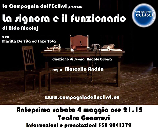 Sabato 4 maggio alle ore 21.00 e Domenica 5 maggio alle ore 19, presso il Teatro Genovesi di Salerno andrà in scena la commedia “La signora e il funzionario” scritta dal drammaturgo e commediografo fossanese Aldo Nicoaj. A portare in scena il testo di Nicolaj, già vincitore nel 1957 del Premio Riccione, è la Compagnia dell’Eclissi che, sotto la regia di Marcello Andria, ha affidato a due suoi membri, Marika De Vita ed Enzo Tota, i rispettivi ruoli femminili e maschili dei protagonisti della commedia brillante. Attraverso colpi di scena e gag comiche, temperate di quell’amara ironia tipica dell’autore, “La signora ed il funzionario” accompagna lo spettatore verso una purificazione quasi alienante in cui ad essere additata è proprio quella società borghese di cui i protagonisti fanno parte. A fare da sfondo come contestualizzazione storica di quegli anni in Italia (Nicolaj scrive la commedia nel 1978) è l’emergenza terrorismo ed il concreto pericolo di eversione che si andava sempre di più imponendo.