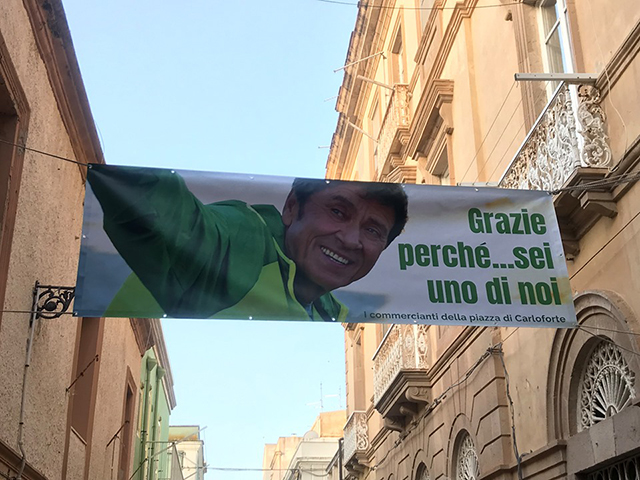 Da alcuni giorni, in pieno centro, uno striscione con il viso del cantante dice