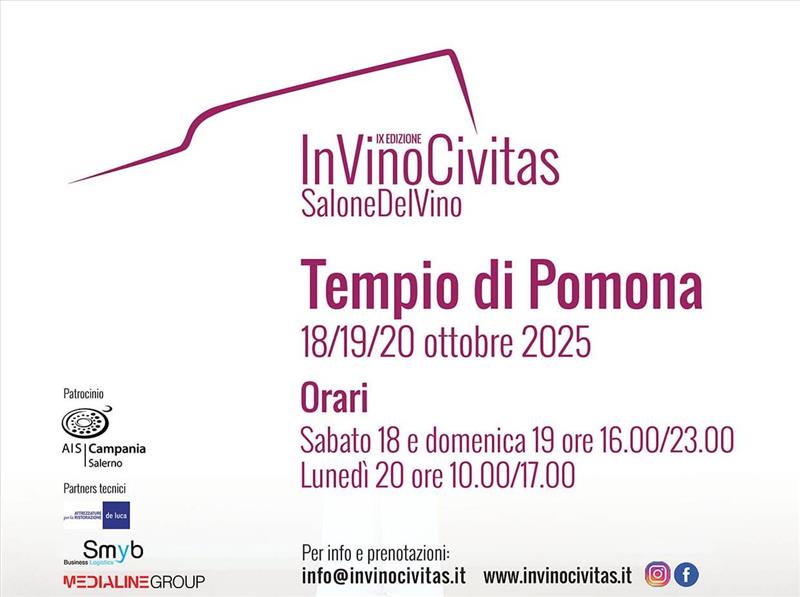 Salerno – Appassionata di percorsi eno–gastronomici e culturali, ho partecipato questo pomeriggio – accompagnando mio figlio Francesco, che ha iniziato da poco il corso di Sommelier, I livello, presso l’AIS di Salerno – alla nona edizione 2025 di In Vino Civitas, il Salone del Vino di Salerno, ospitato in una location innovativa e prestigiosa quale è il Tempio di Pomona, nel centro storico di Salerno.