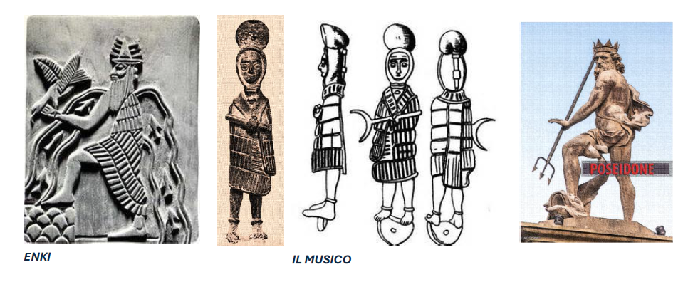 Il Bronzetto regge sulla testa un oggetto (un tamburo secondo la scienza ufficiale); guardiamolo da tutti i lati, sembra un otre per l’acqua (Enki, dio delle acque). Il bastone non più biforcuto, ma tridente, lo ritroviamo nelle rappresentazioni del dio dell’acqua Poseidone (Nettuno per i romani). Enki abitava presso le sponde del fiume Oceano. (più tardi vedremo perché questo dettaglio è importante).