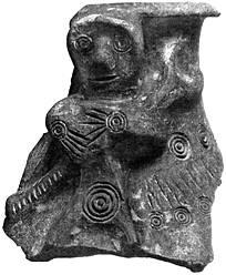 Il coccio ceramico rinvenuto nel pozzo di S. Anastasia a Sardara tiene in braccio un bastone biforcuto da rabdomante. Ora guardiamo un bassorilievo raffigurante Enki e confrontiamolo con il bronzetto sardo denominato il musico essi hanno un mantello uguale.