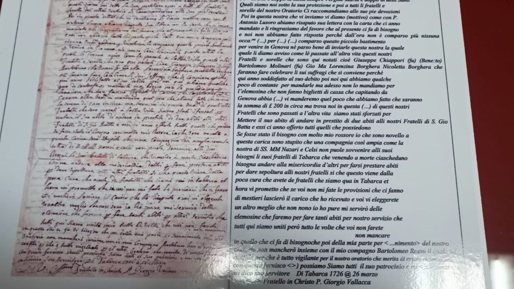 La giornata di sabato si è aperta a Villa Lomellini-Rostan, dove i partecipanti hanno potuto ammirare un affresco raffigurante l’isola di Tabarca con il vessillo di Genova issato sul forte genovese. Il convegno, ospitato a Villa Doria, è stato organizzato con il supporto del Centro Universitario del Ponente, che ne ha curato la gestione con rigore e grande disponibilità. La chiusura si è svolta nell’Oratorio dei Santi Nazario e Celso di Multedo, dove sono state esposte le lettere originali che documentano i rapporti fra la confraternita genovese e la “sorella” tabarchina.