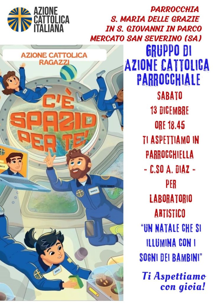 Il laboratorio è dedicato ai bambini, per realizzare addobbi. Poi si creerà un albero di Natale da esporre in parrocchia. Sarà – nelle intenzioni degli associati – solo una delle tante occasioni esperienziali da vivere, tutti quanti assieme. Che si tratti di una “lectio” sul Vangelo, tenuta da don Peppino Iannone (in qualità – anche – di assistente spirituale Ac) o di un assaggio di pizza o di occasioni per giocare, scherzare, in modo sano, consigliamo di “tener presente” l’Azione Cattolica parrocchiale.