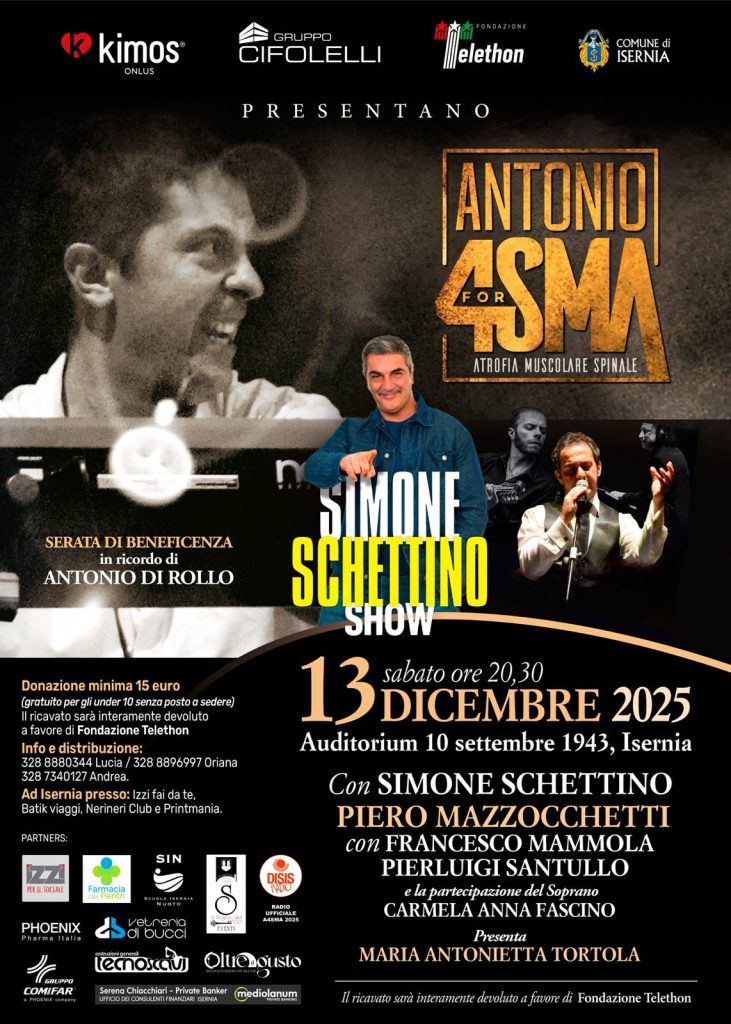L’edizione 2025 di “Antonio 4 Sma”, prevista per questa sera, chiude, con la serata di gala e di beneficenza presentata dalla giornalista Maria Antonietta Tortola, la “Smaratona Telethon Città di Isernia”, organizzata da Kimos Onlus in collaborazione con la Fondazione Telethon e con il sostegno del “Gruppo Cifolelli”, del Comune di Isernia e dell’associazione “Famiglie Sma”.