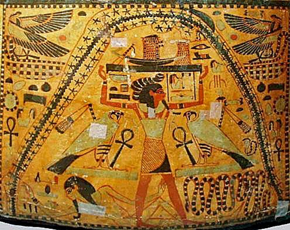 Shu era il Dio dell’aria che separa la terra dal cielo e veniva rappresentato con le braccia in alto intente a sorreggere la volta celeste