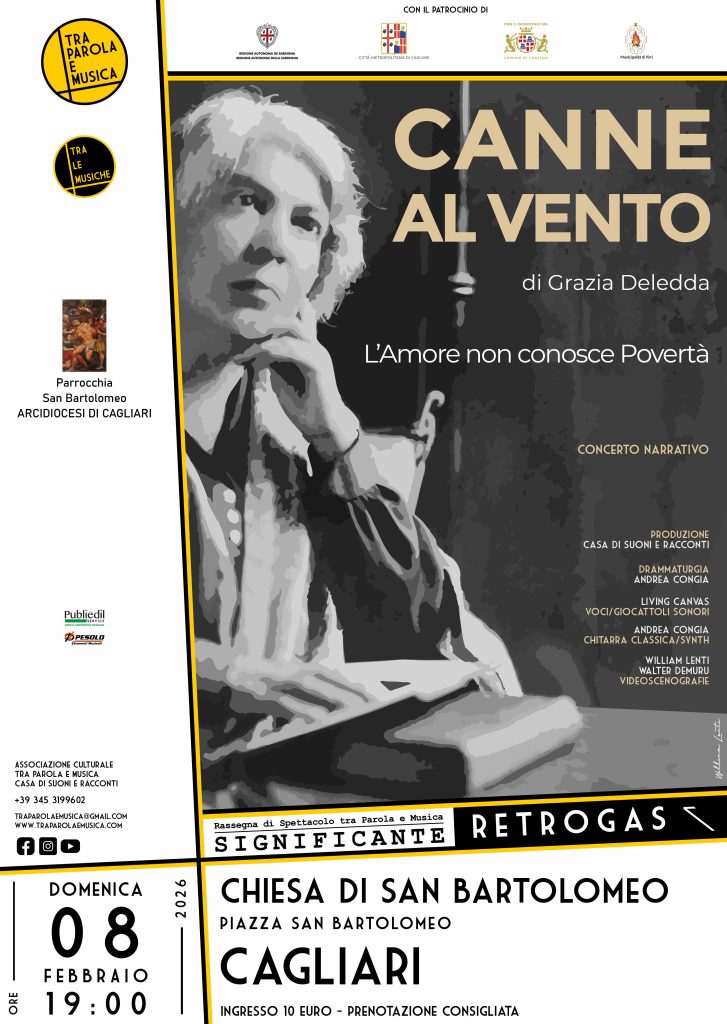 Domenica 8 febbraio 2026, alle ore 19, la Chiesa di San Bartolomeo di Cagliari diventerà spazio narrativo e sonoro per un concerto-racconto che intreccia parola, musica e immagini. Canne al vento, pubblicato nel 1913 dall’editore Treves, è un testo chiave non solo della letteratura sarda, ma della narrativa europea del primo Novecento: un romanzo corale e simbolico, in cui l’esistenza umana è paragonata alle canne scosse dal vento del destino, fragili eppure ostinatamente radicate alla terra.