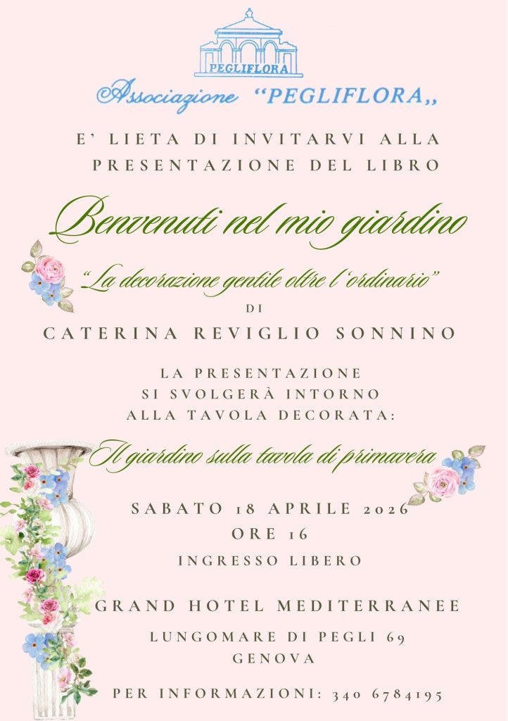 Sabato 18 aprile, alle ore 16, negli spazi dello storico albergo affacciato sul Lungomare di Pegli, sarà presentata l’opera Benvenuti nel mio giardino di Caterina Reviglio Sonnino. L’incontro si svolgerà in una forma particolare e immersiva: attorno a una tavola decorata appositamente per l’occasione, intitolata “Il giardino sulla tavola di Primavera”, che diventerà fulcro scenografico e narrativo della presentazione stessa.