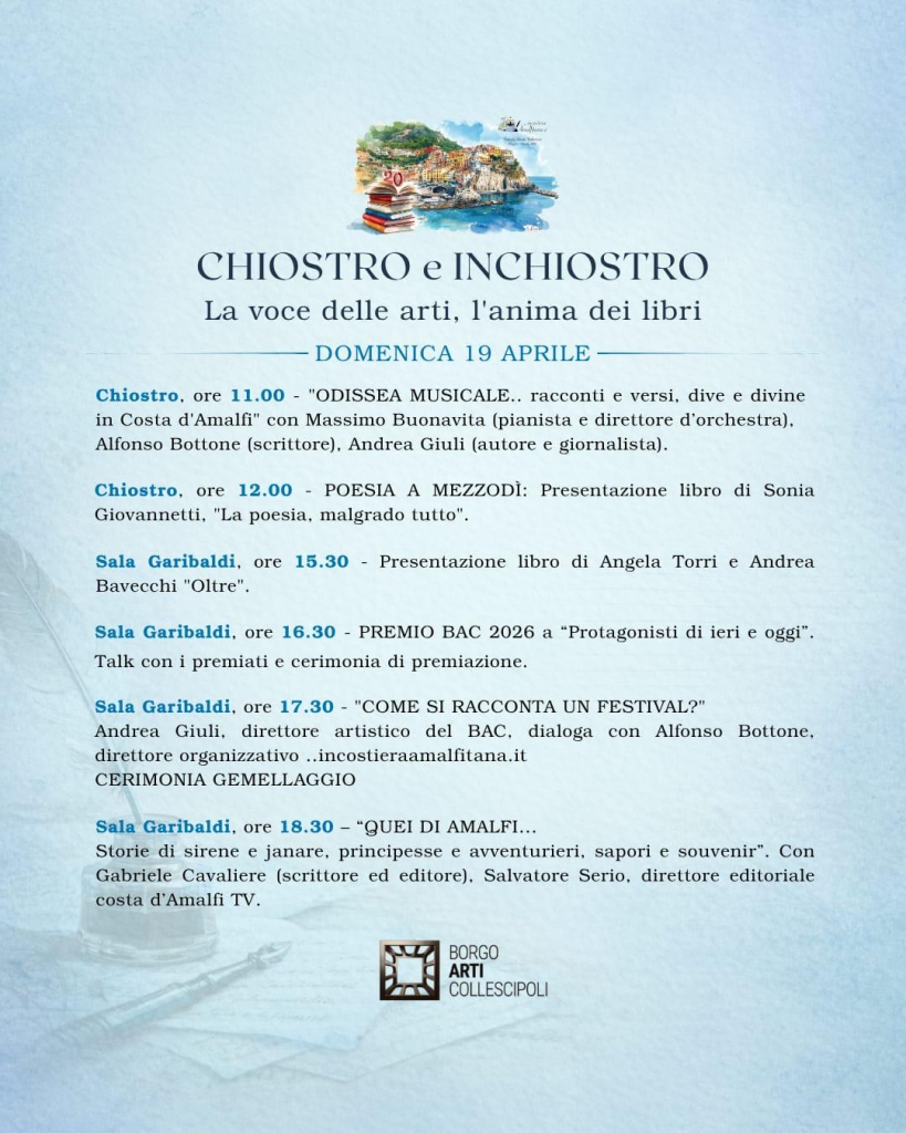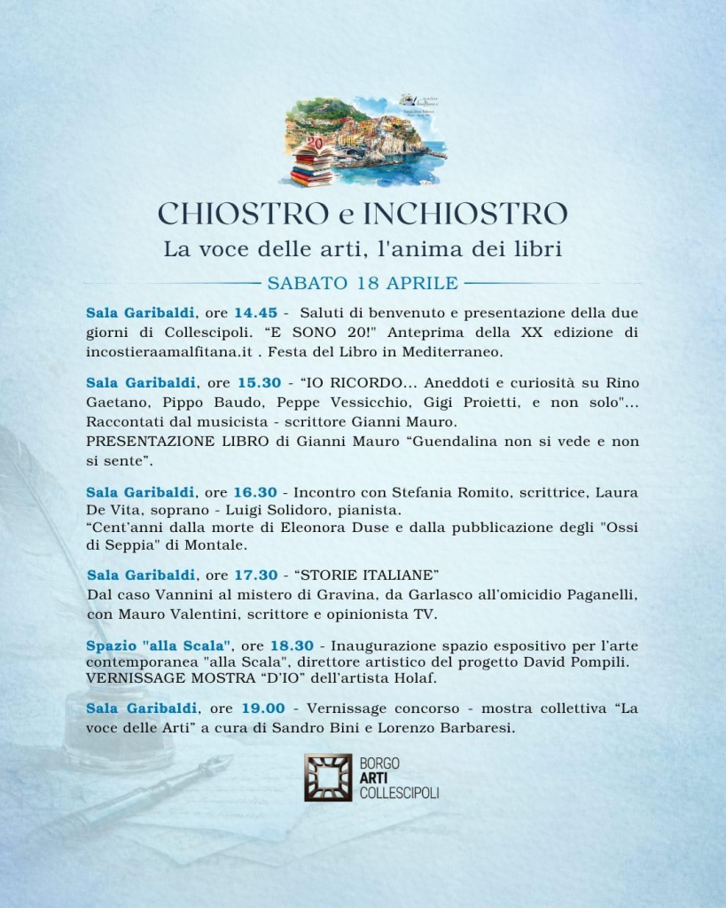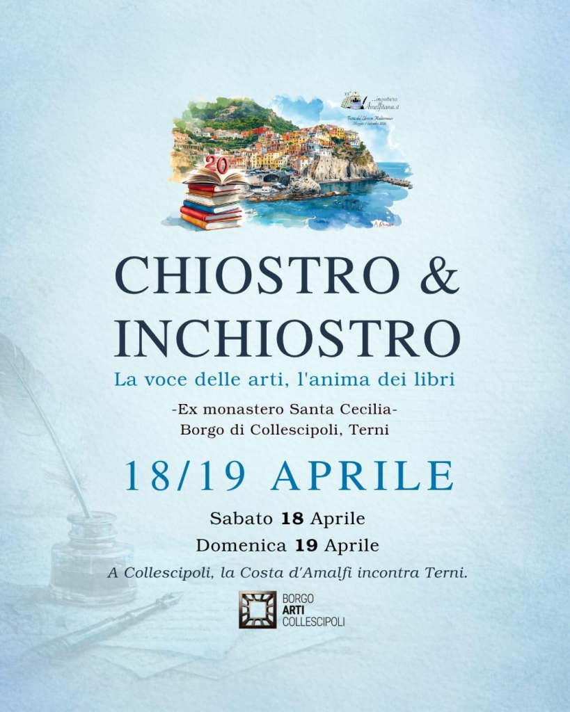 Fervono i preparativi nel borgo umbro di Collescipoli per l’edizione 2026 di “Chiostro e Inchiostro”, in programma il 18 e 19 aprile. Il dialogo tra arti, parole e creatività darà vita a una due giorni che intreccia esperienze culturali e sociali, promossa da BAC – Borgo Arti Collescipoli insieme alla 20ª edizione di ..incostieraamalfitana .it Festa del Libro in Mediterraneo, ospitata nel chiostro cinquecentesco dell’ex Monastero di Santa Cecilia.